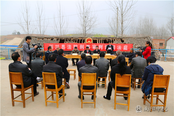 春天的淅川县老城镇秧田村四组是个美丽如画的地方,山脚下一片片青绿的麦苗和一片片金黄的油菜花,将这个小山村仿佛装进了一幅色彩鲜艳的油画中。巡回审判庭就将庭审现场设置在老城镇二小门外的操场上,远处就是一大片油菜花田。