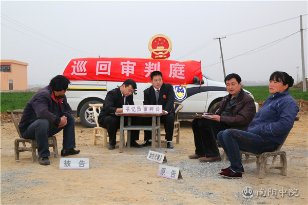 村头麦地边有一片大的空场,巡回法庭就设在那儿。一辆警车横在麦地前,厚坡法庭法官熟练地将巡回法庭横幅挂在车前,然后又将国徽支在了车顶,一个简易的巡回法庭已搭起了一半。没有桌子和凳子,就到附近老乡家里去借,可算来算去,好像还是不够。这时,厚坡法庭的庭长张玉峰搬着一把太师椅走了过来,他开玩笑说:“老乡知道开庭,特意借了一把太师椅。”