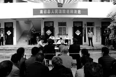 4月25日,在蒙蒙细雨中,南召县法院刑事审判庭在该县王村村委会大院,对滥伐林木的被告人刘某进行了公开审理,给当地百姓带去了一次生动的法制课。部分乡村干部和群众代表100余人旁听了庭审。通讯员王阳曹逢春摄影报道