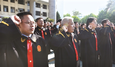 昨天,市中级法院首批入额的98名员额法官向宪法庄严宣誓。 本报记者 蒋宁宇