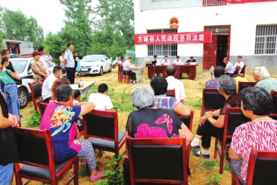 近日,方城县法院在该县博望镇某村公开巡回审判一起土地承包经营权纠纷案件,使群众零距离感受了法院庭审活动的全过程,当地干群都称赞这种最直接的普法方式真是好。
