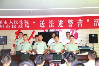 积极开展“送法进军营”等活动30余次,给官兵们讲一堂实用法制讲座,赠送一批法律书籍,发放涉军维权法律援助联系卡,公布涉军维权热线电话,畅通沟通联系渠道。在活动中,该院借助以案释法、庭审观摩、法律咨询、法律讲座等形式,加强广大官兵依法办事意识和解决涉诉问题能力。