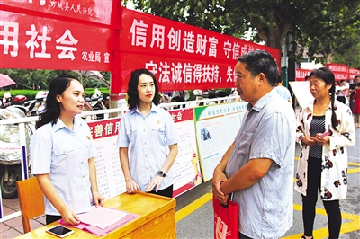 9月19日上午,方城县人民法院组织干警在该县主街道凤瑞路开展以“诚信守信”为主题的集中宣传活动。图为干警在宣传活动现场解答法律咨询。