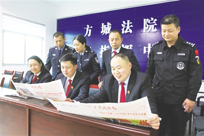 连日来,方城县人民法院执行局通过制作固定宣传展板、电子显示屏,收看电视新闻、阅读报刊等多种形式,掀起学习十九大精神的热潮。图为10月30日下午,该局干警阅读十九大专题报道文章