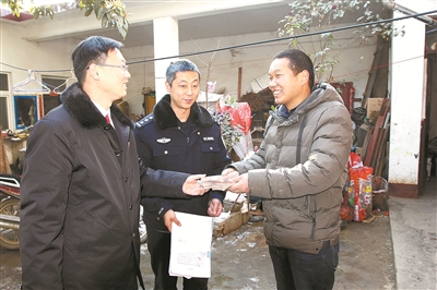 1月12日,河南省方城县人民法院执行干警来到方城县杨集乡唐楼村西桃园组,将3万余元执行款送到农民工牛某家中。牛某对法院能够快速执行案件并把执行款及时送到家中的举动连声道谢。程远景 摄