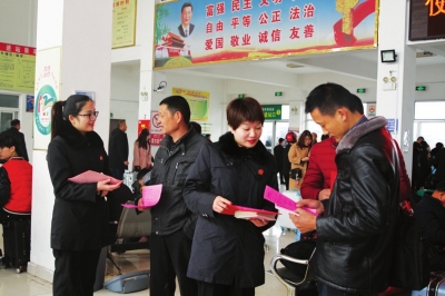 2月24日,社旗县法院的法官到车站、社区、农村等人口密集地区进行普法宣传,为外出务工人员送去法律知识。