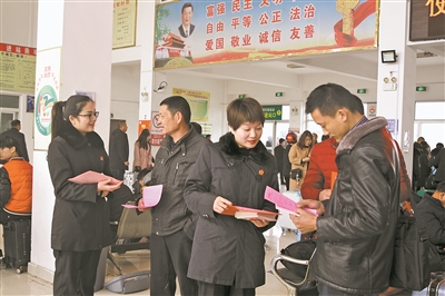 春节假期陆续结束,2月24日,河南省社旗县人民法院的法官深入车站、社区等人口密集区开展普法宣传,为外出务工人员送上法律“护身符”。
