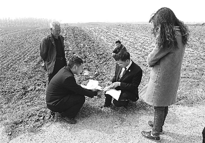 方城县法院博望法庭干警到辖区广阳镇某村就一起土地承包纠纷案件实地勘验现场,及时化解纠纷