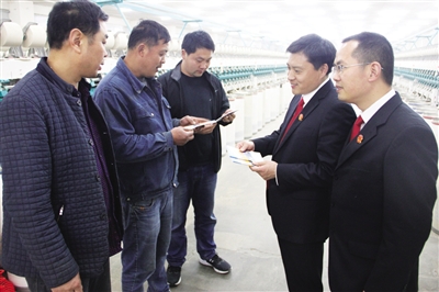 4月23日,唐河县人民法院桐寨铺法庭的法官们赶到辖区皓晟棉业有限公司进行普法宣传,向工人们发放普法维权手册,并现场解答劳动合同签订、工资讨要、工伤维权、社会保险缴纳等问题。