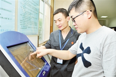5月25日,当事人在卧龙区法院诉讼服务中心的触摸屏上查询案件信息,这是该院不断加强法院信息化建设,打造综合诉讼服务平台出现的可喜变化,大大方便了群众
