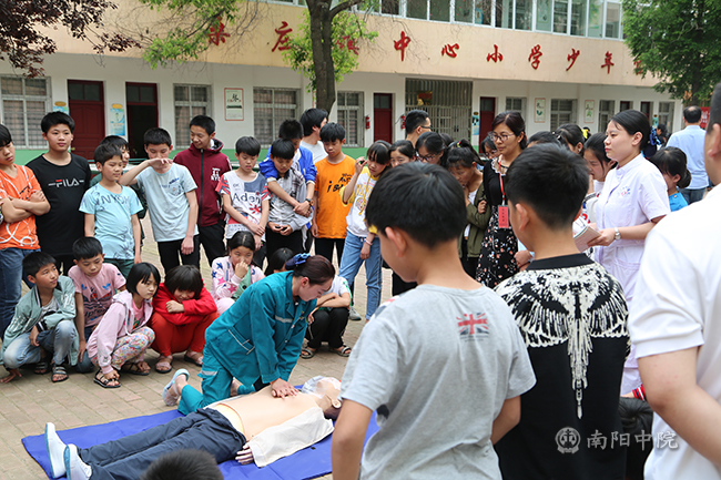 与此同时,在桑庄镇中心小学,健康检查和宣教活动在校园内有序进行。口腔医生向孩子们讲授了口腔健康知识和规范的刷牙动作,并告诉孩子们正确的口腔保健知识;心内科医生为孩子们进行心脏病筛查;儿童康复医生对有相关健康问题的儿童提出医学建议,指导教师、家长科学合理的进行儿童保健;护士们也对学生们进行心肺复苏和海姆立克急救法演示,传授必要的急救知识。