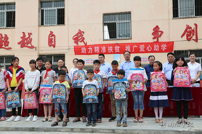 健康检查结束后,邓州市法院党组成员、纪检组组长沙岩林、驻村第一书记周海鹏和邓州市中心医院副院长田园、桑庄镇副镇长亚东等为桑庄小学18个教学班的90名优秀学生发放了书包、文具盒和彩笔等文具,用实际行动关心贫困儿童健康成长,传递正能量。