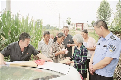 6月20日上午,河南省淅川县人民法院执行干警奔波80多公里,来到该县盛湾镇单岗村、姚营村为8名申请执行人送来劳务款共计52255元。图为法官将执行款送到申请人手中。张长海 白 淼 摄
