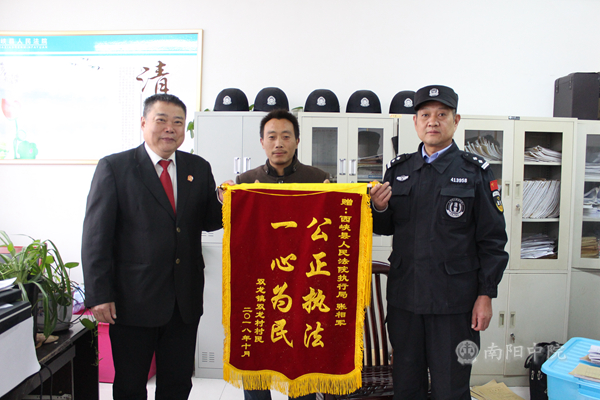 11月5日上午,申请人魏某来到西峡县人民法院,将一面写着“公正执法,一心为民”的锦旗交到了执行干警手中,对执行干警穷尽措施,为其讨回八万余元借款表示感谢。