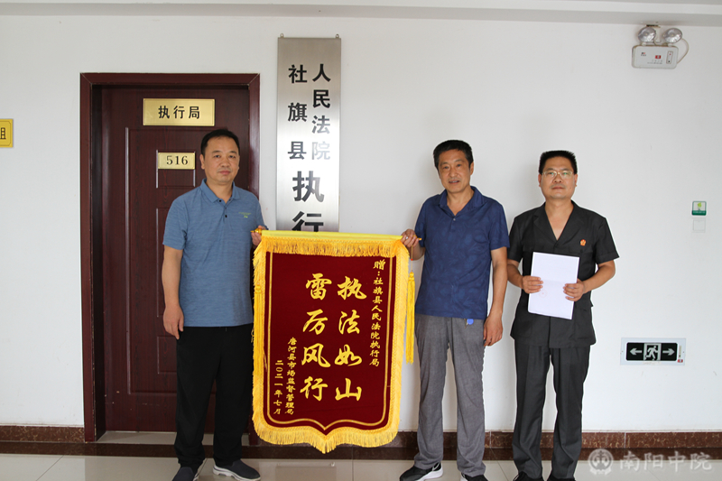 7月13日,一面写着“执法如山,雷厉风行”的锦旗和一封饱含深情的感谢信送到了社旗县人民法院执行局局长冯春光和执行法官杨明宣的手中,唐河县市场监督管理局工作人员按耐不住激动的心情,说道:“你们执法如山、雷厉风行的执法办案作风堪称楷模,我们发自内心感动感激感谢,感谢社旗法院执行局公正高效办案,维护了法律权威和政府部门公信力。