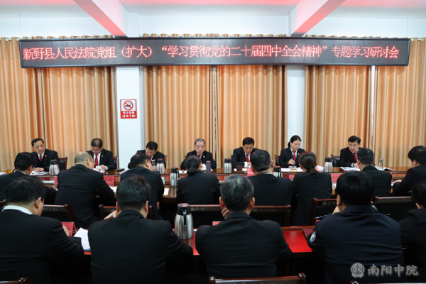 11月14日,河南省新野县人民法院召开党组(扩大)会议,专题学习贯彻党的二十届四中全会精神,深入领会全会核心要义,研究部署落实举措。院班子成员、各部门负责人及员额法官参加会议。