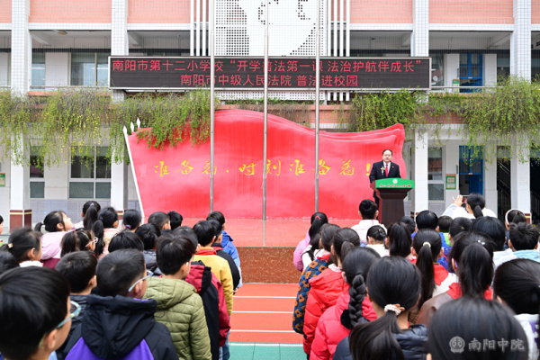 3月18日上午,迎着春日的暖阳,河南省南阳市中级人民法院走进南阳市第十二小学白河路校区开展送法进校园活动。在庄严的国旗下,该校法治副校长、南阳中院执行局执行一庭庭长王飞舟以“法治护成长 平安伴我行”为主题,为全校1000余名师生带来一场生动有趣、意义深远的“开学法治第一课”。